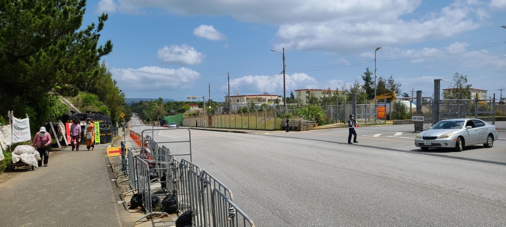 15-minute walk from the Camp Schwab personnel entry gate is construction vehicle gate where every weekday, protestors sit-in to block the construction vehicles so that less vehicles could get in and delay the construction.