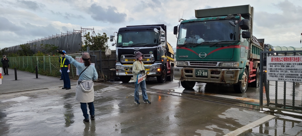 In Abu and Shiokawa ports located on the opposite side of the island, where soils for the reclamation is being transported from nearby mountains to Henoko, local protestors stand in front of trucks to slow the work.