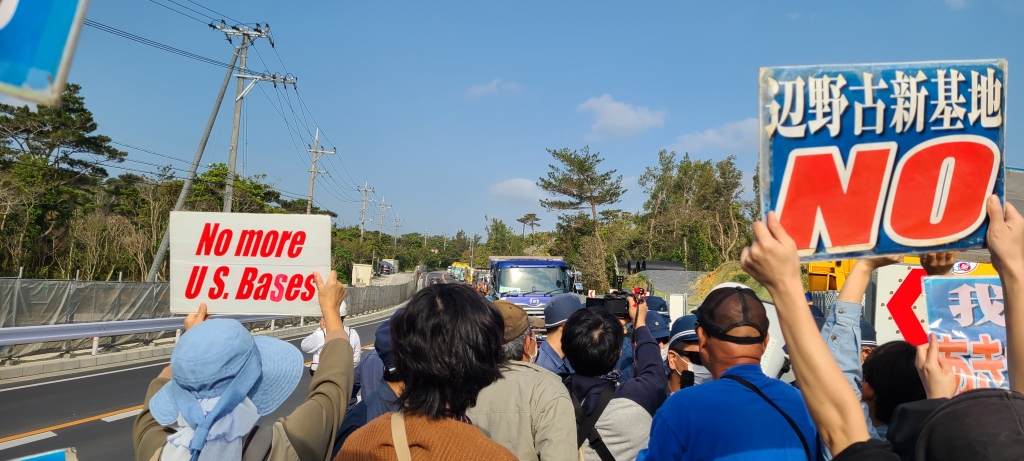 Since the plan was announced, locals and activists from all over Japan have been protesting the new base construction by holding referendums, supporting candidates of mayoral and gubernatorial election, and municipal assembly members, who oppose the construction, as well as sit-in demonstration at the gate of Camp Schwab and kayaking at the landfilling site as civil disobedience act. Until now, tens of protesters were arrested and injured by police at the gate or coast of Camp Schwab.