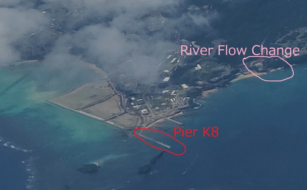 As shown in the below photo taken on 12 September 2022 from the airplane, the red circle is pier K8 which has been extended. The pink circle area is the construction site of River Flow Change to the sea. That river, called Bisha-gawa pours cold water into the bay, which cools down the temperature of the sea water so that many unique species can survive.