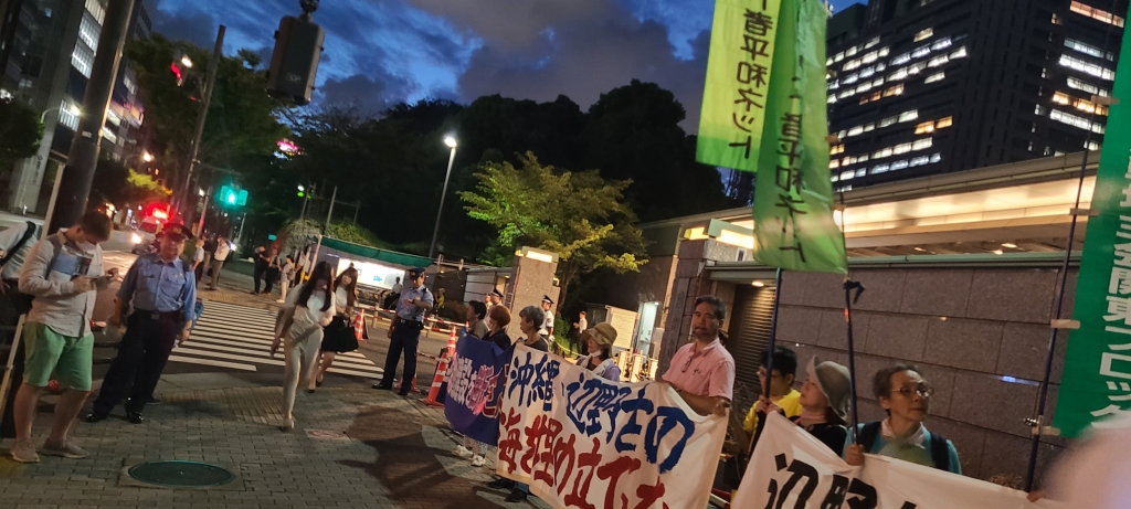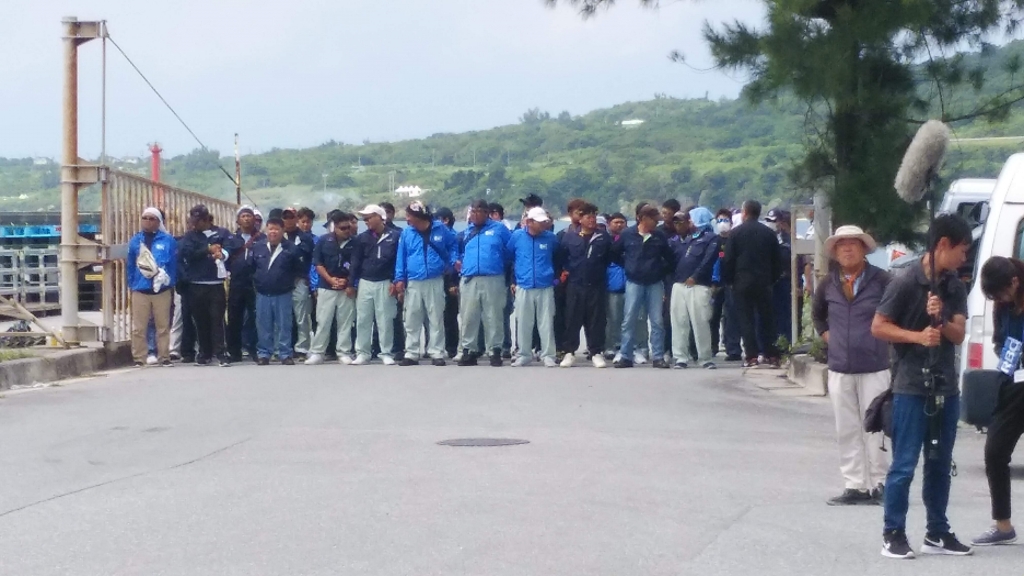 Even port workers were standing at the entrance as human shield. The workers oppose military use of the port because they want to allow only civilian use. After 10 hours of sit-in protest, Marine vehicle with the boat on a trailer had to leave the port to go back to Camp Schwab.