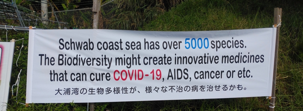 Great biodiversity for humanity lies in the sea. (The banner posted at the entrance gate of Camp Schwab where servicemen and women, and workers pass)